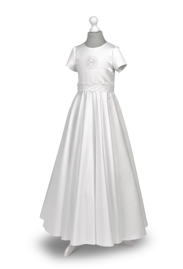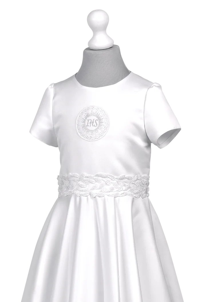 Model Alicja SR-136 to prosta i efektowna sukienka komunijna wykonana z satyny nadającej jej elegancji. Klatkę piersiową zdobi emblemat IHS w delikatnym odcieniu srebra. W pasie dookoła naszyta piękna taśma ozdobna.