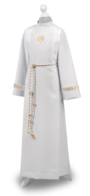 Albę wykonano z białego stretchu - materiału łatwego w utrzymaniu czystości oraz prasowaniu. Odpowiednie dodatki są przemyślane i podkreślają charakter całości. Sznur liturgiczny, taśma ze zdobieniami na rękawach oraz emblemat IHS idealnie komponują się ze strojem i estetycznie ozdabiają.