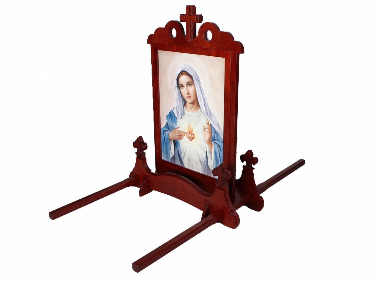 Dwustronny feretron na obraz wykonany z sklejki. Feretron wykonany w ozdobnych ramach umieszczony na piedestale, do którego mocowane są drążki służące do noszenia w czasie trwania procesji. Drążki do feretronu wykonane są z drewna o długości 150 cm. Cena feretronu dodatkowo obejmuje 2 obrazy wybrane z oferty o wymiarach 70 x 50 cm (blejtram). Wysyłka feretronu w 3 paczkach (drążki, podstawa, obraz).
