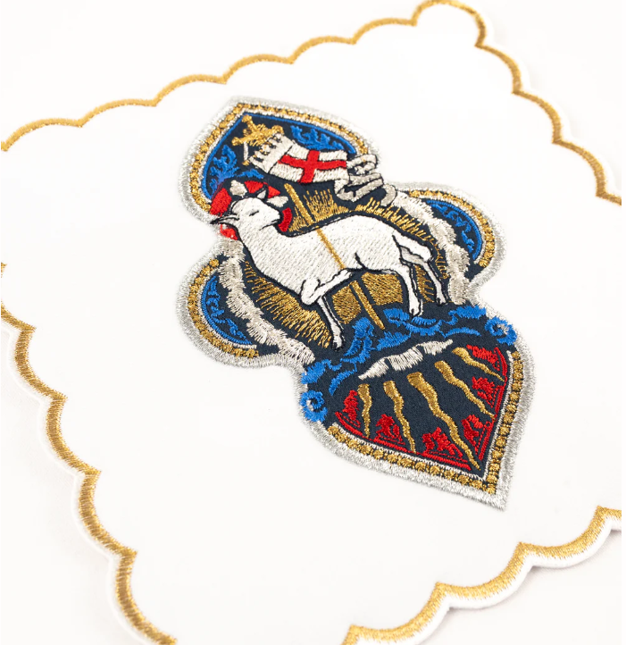 Bielizna kielichowa wykonana z wysokiej jakości tkaniny, zdobiona haftem eucharystycznym wykonanym złotymi nićmi, który przedstawia Baranka Bożego z chorągiewką. Komplet kielichowy składa się z czterech części: palki, korporału, puryfikaterza oraz ręczniczka. Ponadto elementy z motywem krzyża stanowią idealne dopełnienie dla palki, na której wyhaftowano symbol Baranka Bożego.