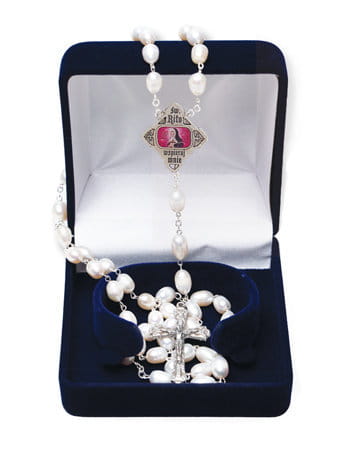 Różaniec z prawdziwych pereł św. Andrzeja Boboli z ryngrafem