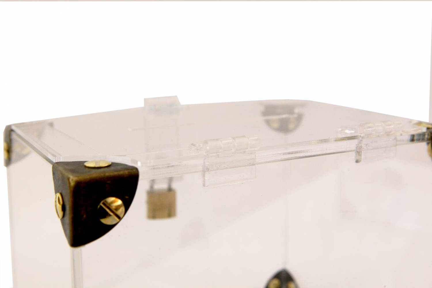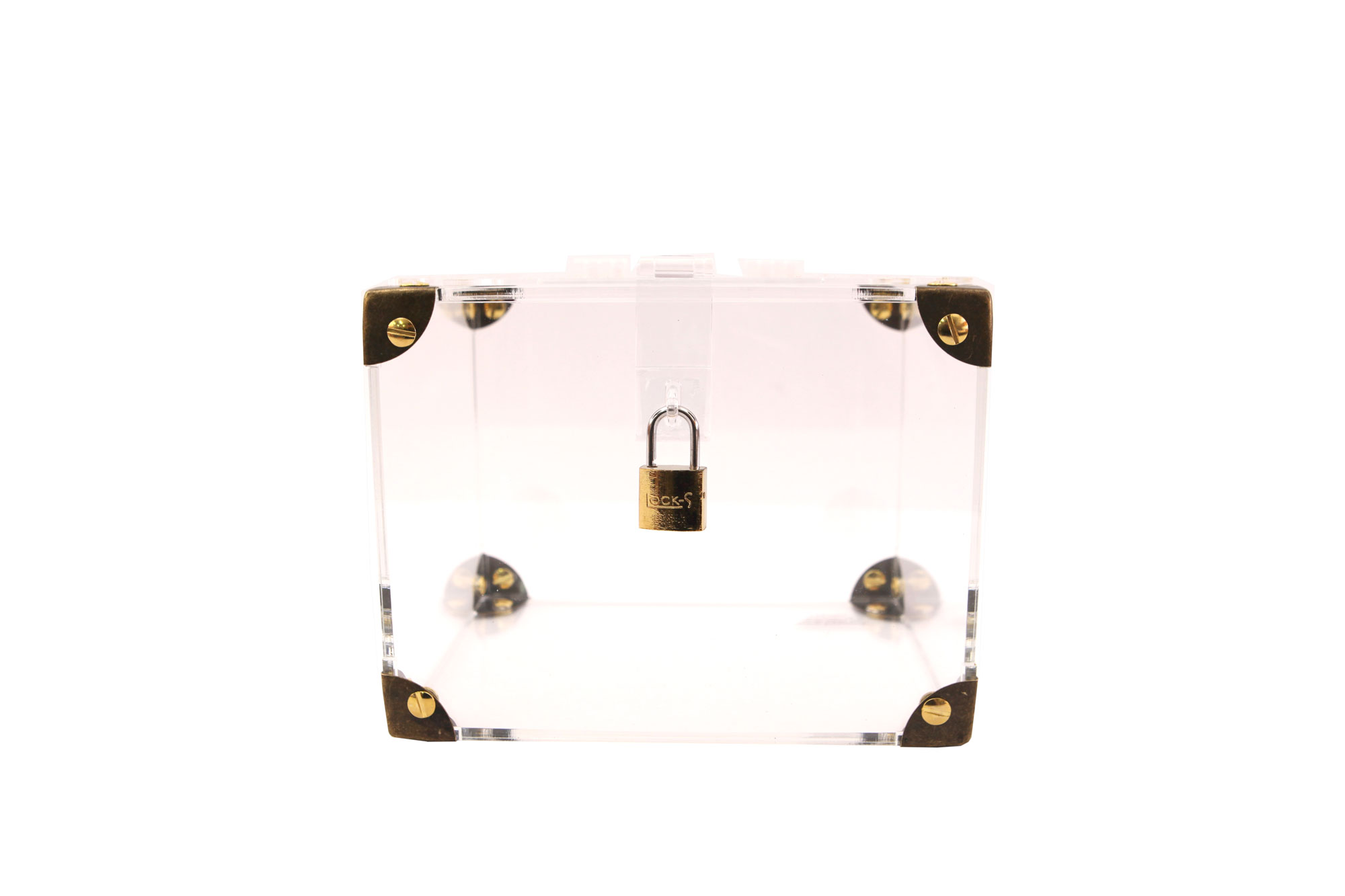 Lekka, przenośna skarbona wykonana z bezbarwnej plexi.
