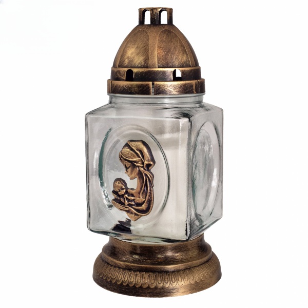 Szklany kwadratowy znicz z wizerunkiem Matki Boskiej, wys. 31 cm