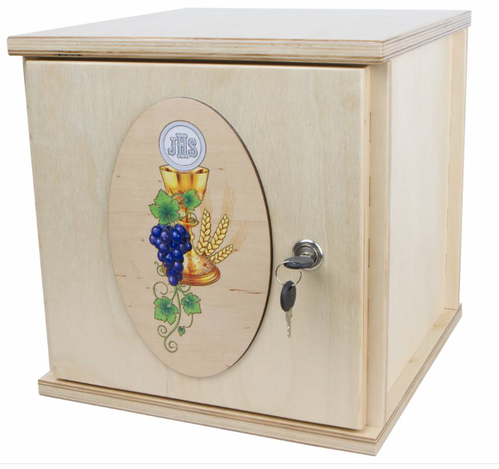 Tabernakulum przeznaczone jest na Triduum Paschalne do ciemnicy. Wykonane z naturalnej sklejki, jest lekkie oraz estetyczne. Na froncie znajduje się ozdobny ornament - kielich. Tabernakulum wyposażone jest w zamek.